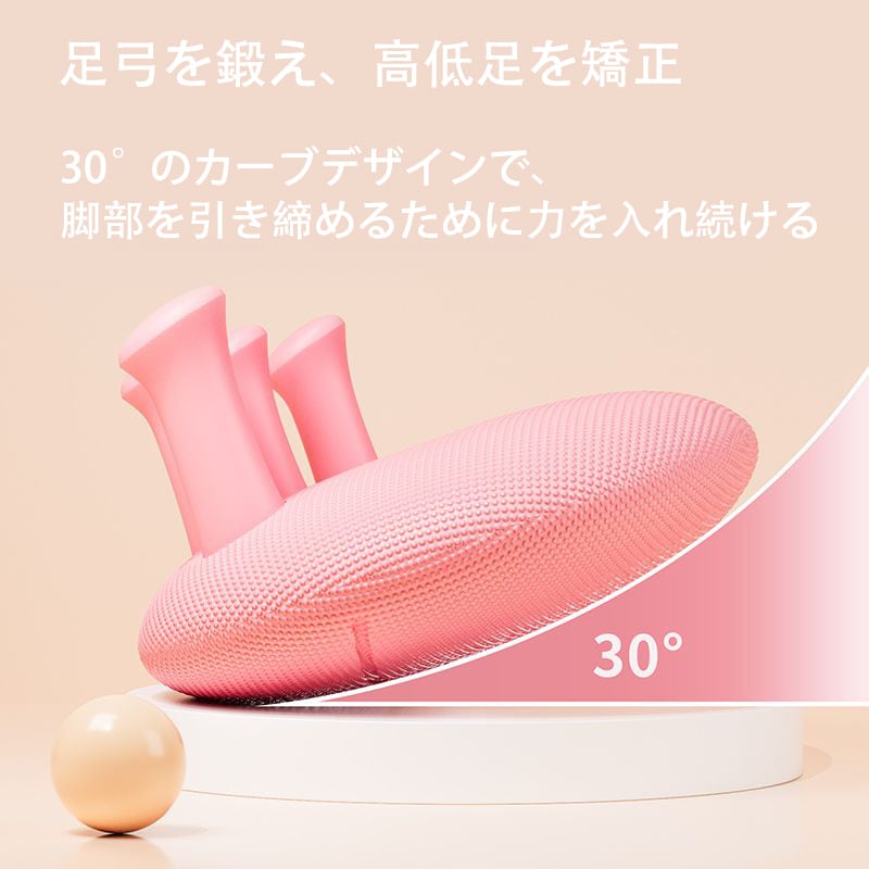 ·高低足弓の矯正: 30°のカーブデザインが足裏アーチを程よくストレッチし、高い足弓・低い足弓(偏平足)を正常な状態へ導くサポートをします。